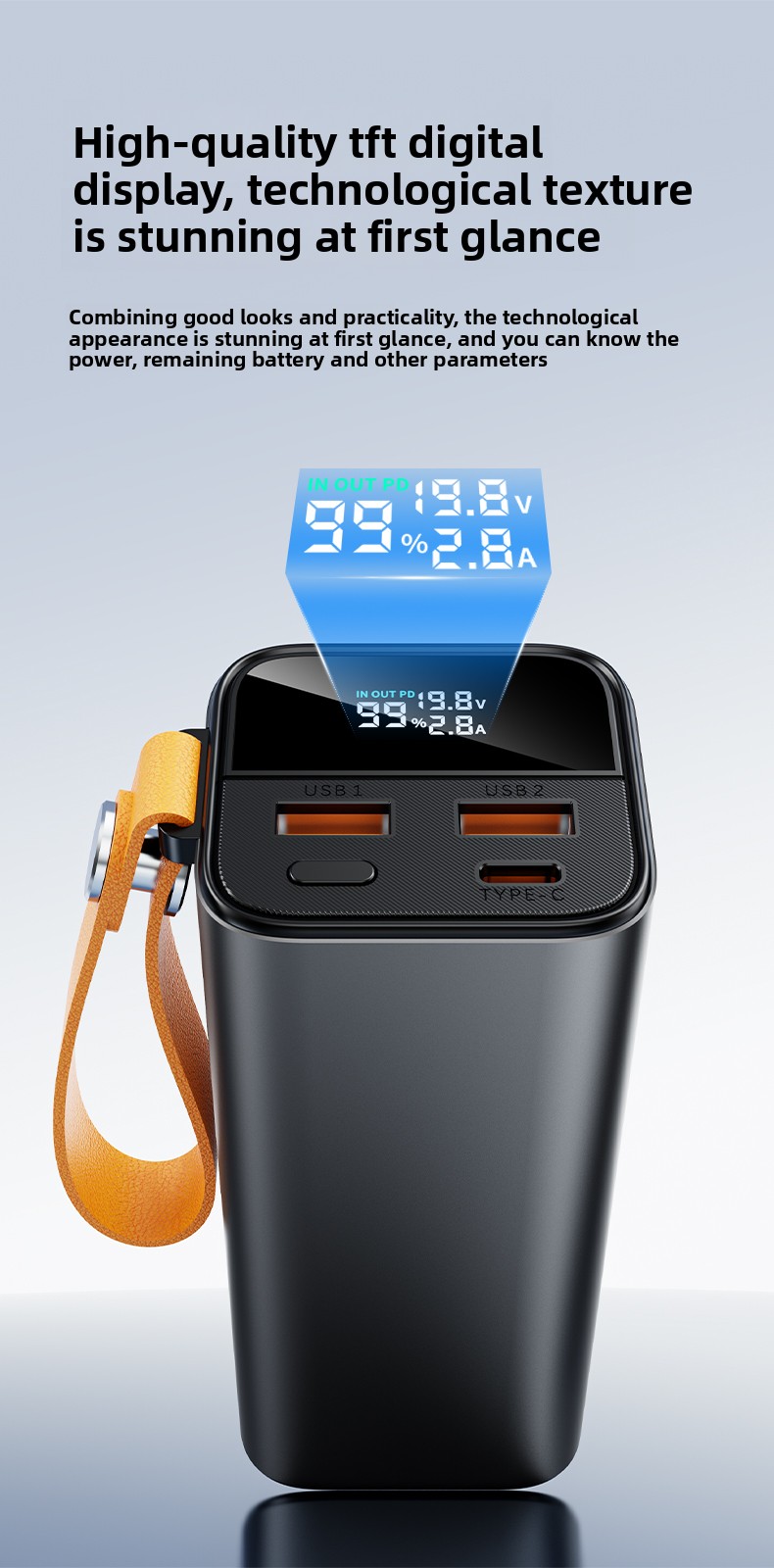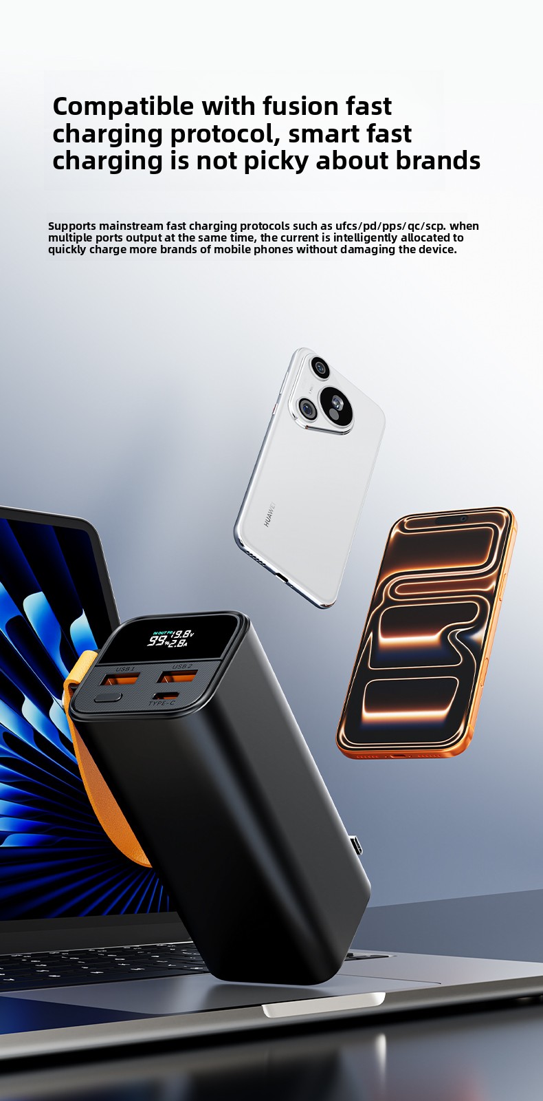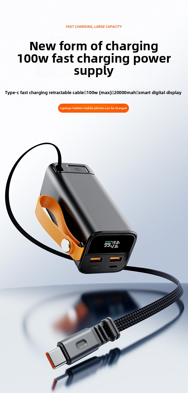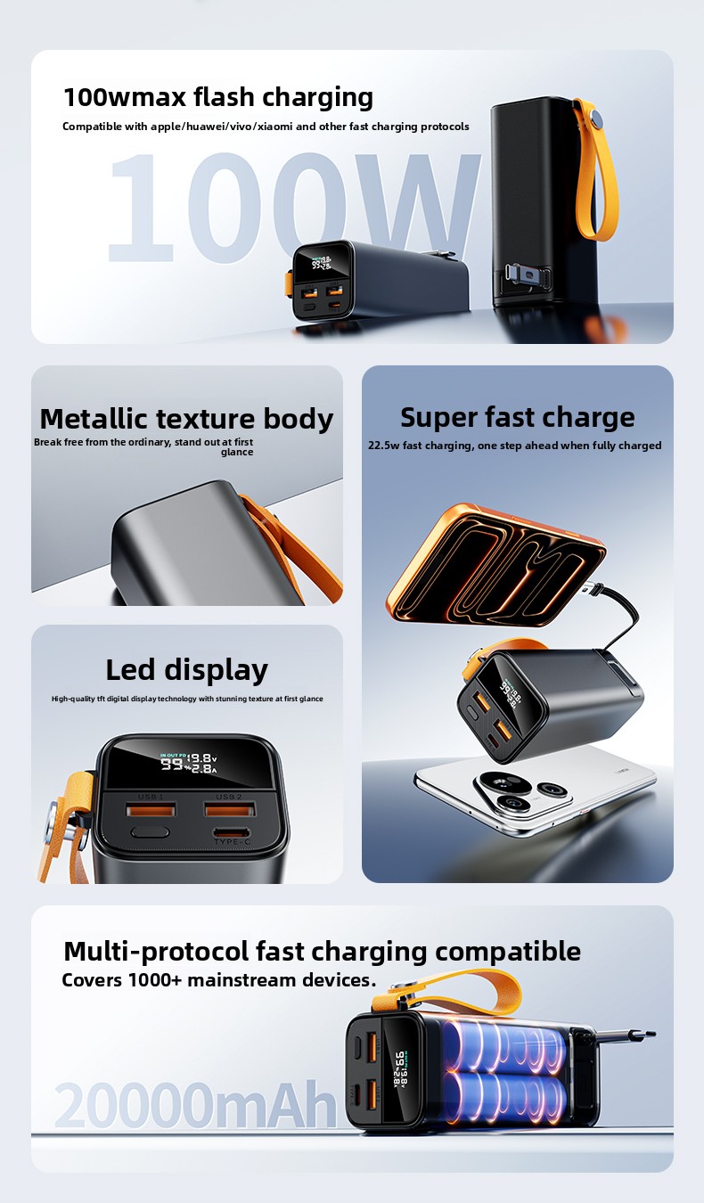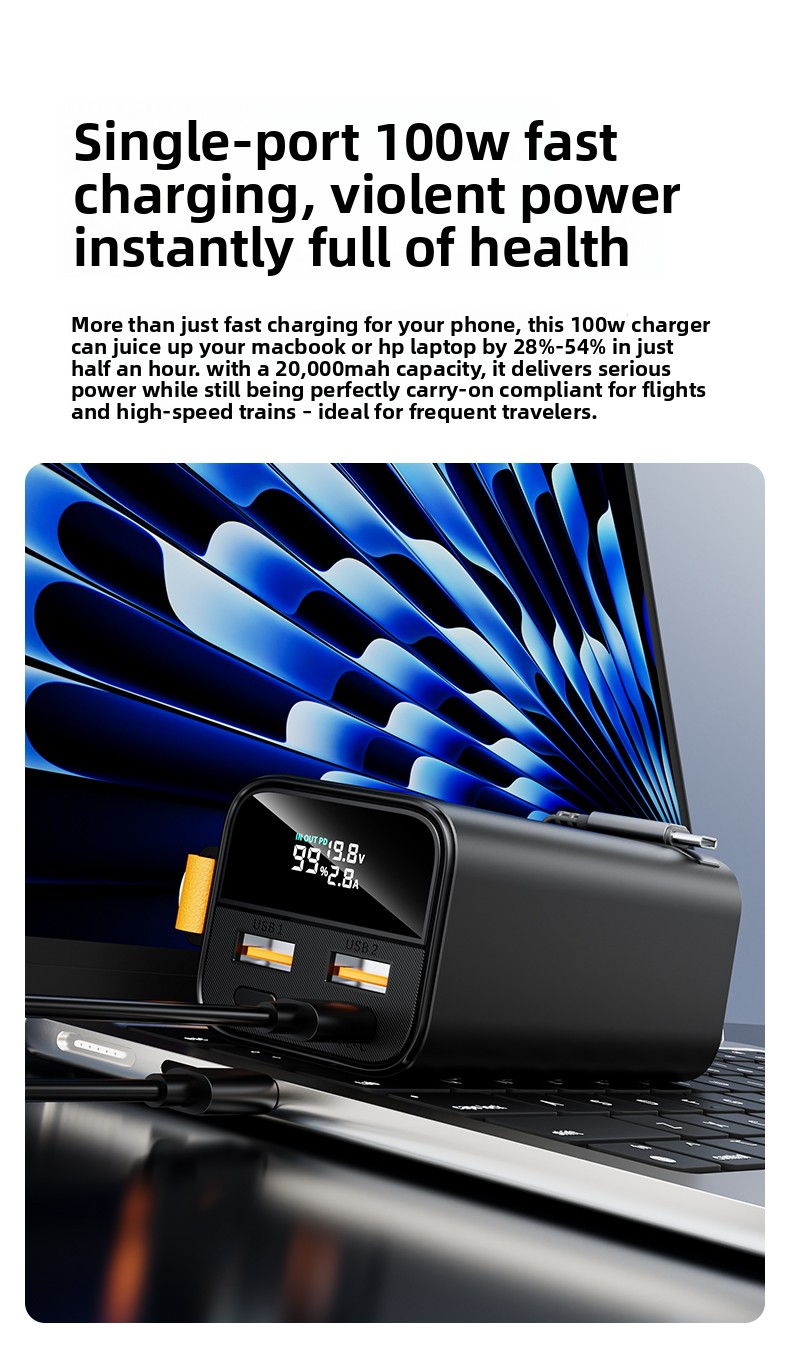 Meet the ultimate portable power solution. Our 20000mAh Power Bank combines massive capacity with blazing-fast 100W output, all wrapped in a durable aluminum-alloy body. Designed for the modern on-the-go life, it's your reliable partner for charging everything from laptops to smartphones, seamlessly.