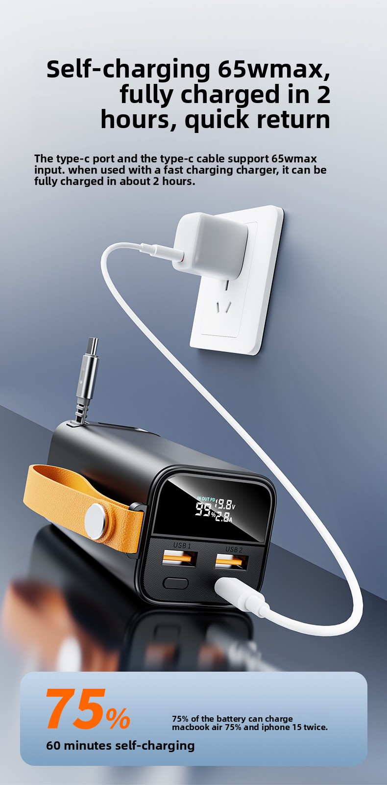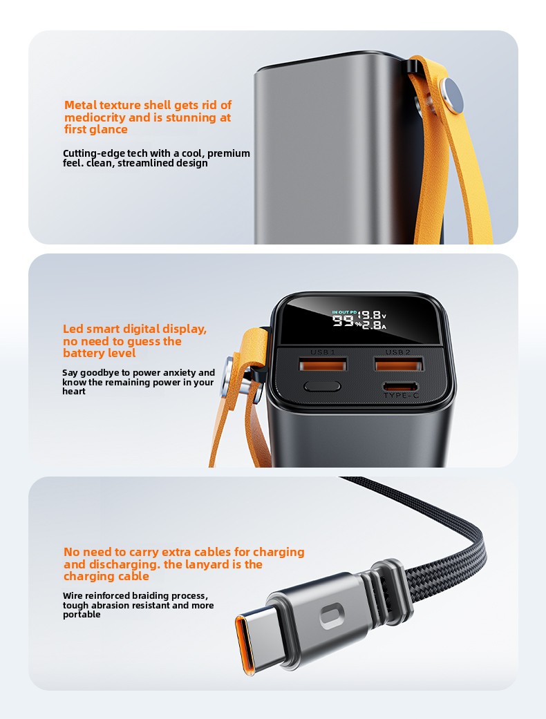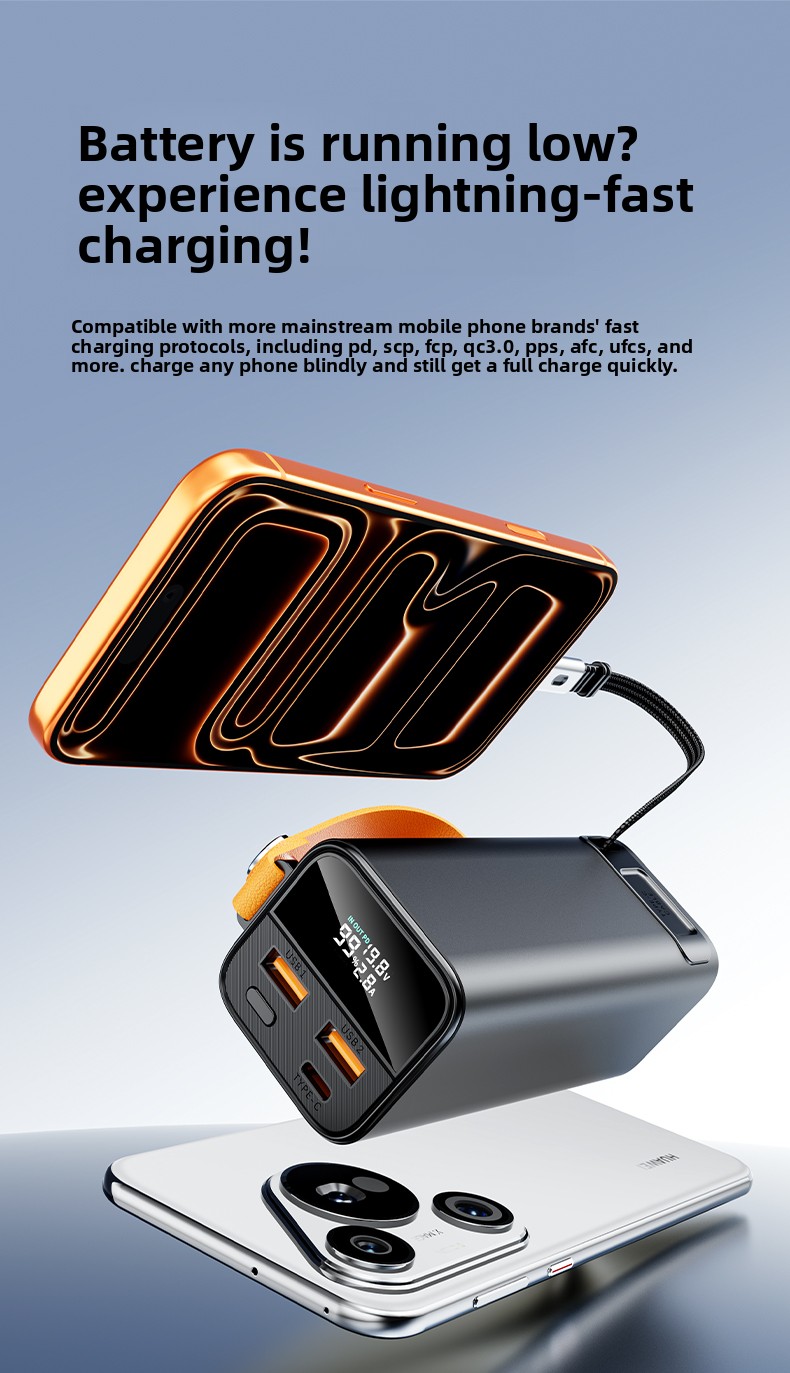 All-in-One Retractable Cable: No more tangled or forgotten cables! The built-in, retractable USB-C cable offers up to 65W input/output. It simplifies charging the power bank itself or your device, making it incredibly convenient and clutter-free.