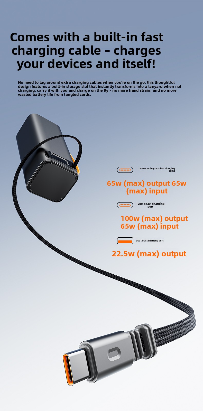 Triple-Port Versatility: Charge up to three devices simultaneously. With one 100W USB-C port, one 65W retractable USB-C cable, and two 22.5W USB-A ports, it meets all your charging needs—from a laptop and phone to a tablet.
