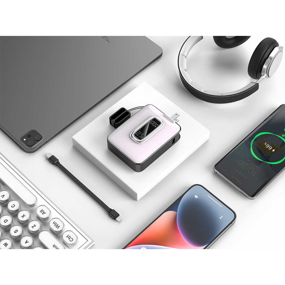 • The unique integrated AC plug lets you charge the power bank directly from any wall outlet—no extra cable needed. It's incredibly convenient for home, office, or hotel rooms, reducing what you need to pack.