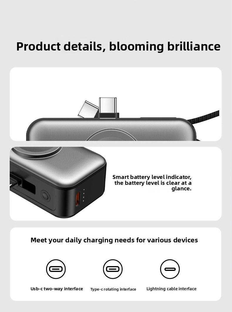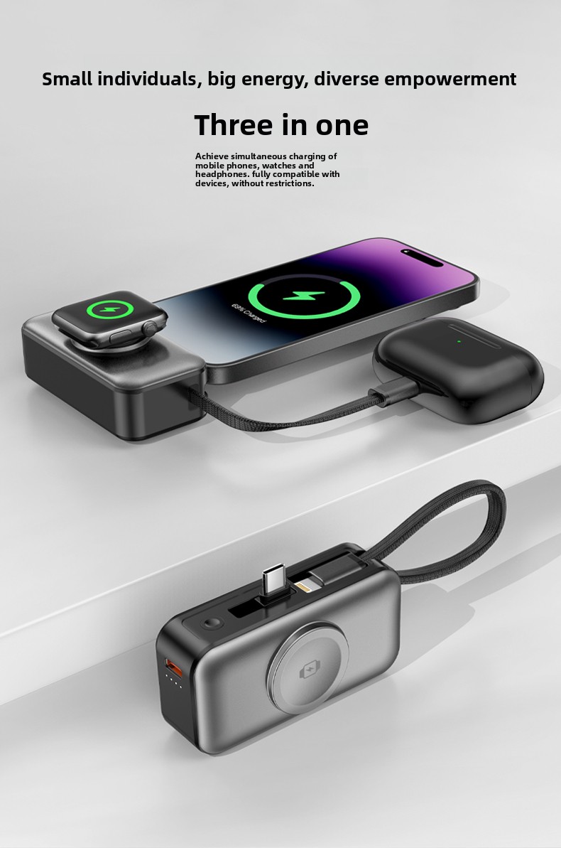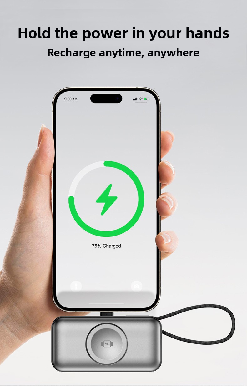 Say goodbye to tangled cables and low battery anxiety. This ultra-compact 5000mAh power bank is designed for users who demand speed, convenience, and versatility. Equipped with PD 20W fast charging, a built-in Type-C cable that doubles as a lanyard, and a dedicated 2.5W wireless charging pad for your smartwatch, it lets you charge your phone and watch simultaneously — anytime, anywhere.