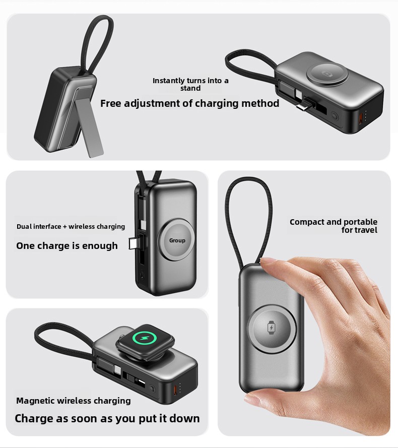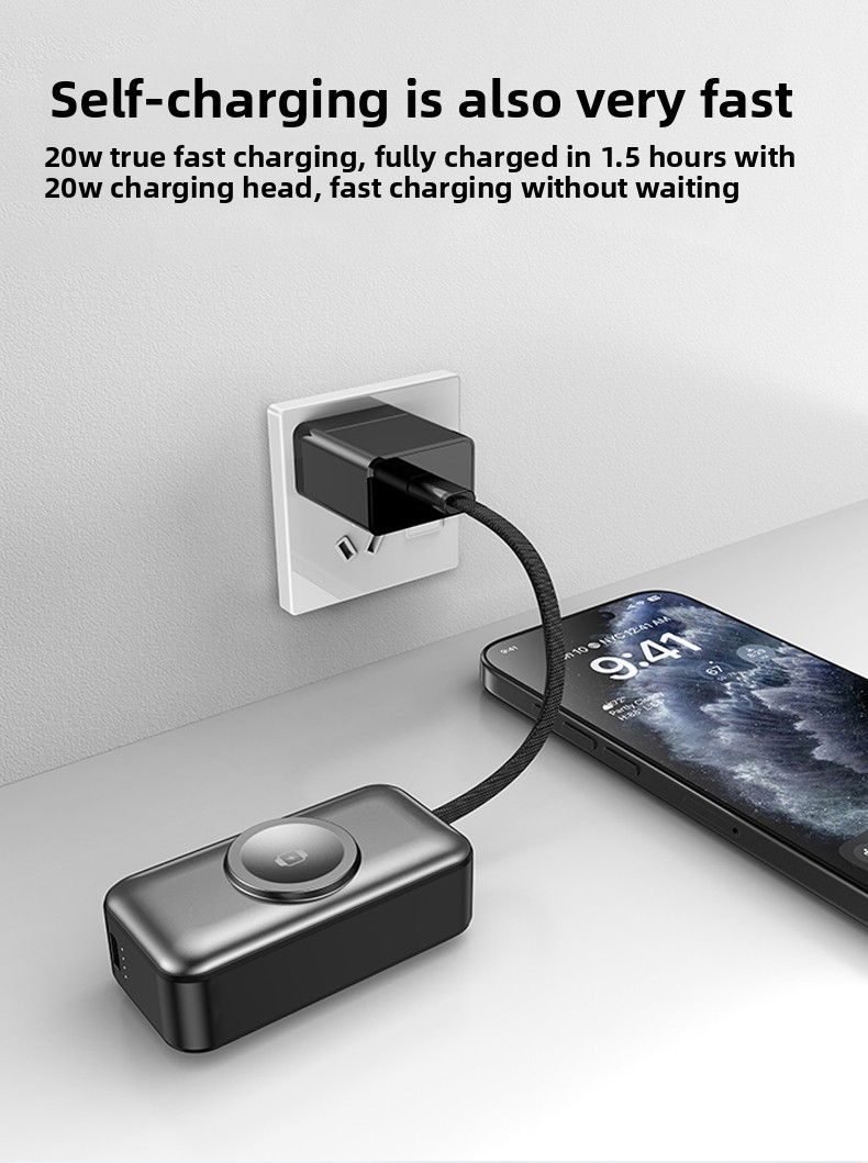 Most portable chargers make you choose between fast charging, convenience, or extra features. This one delivers all three — PD 20W, a built-in cable, and watch charging — in a sleek ABS body that slips into any pocket. No more hunting for outlets or carrying a separate watch puck.