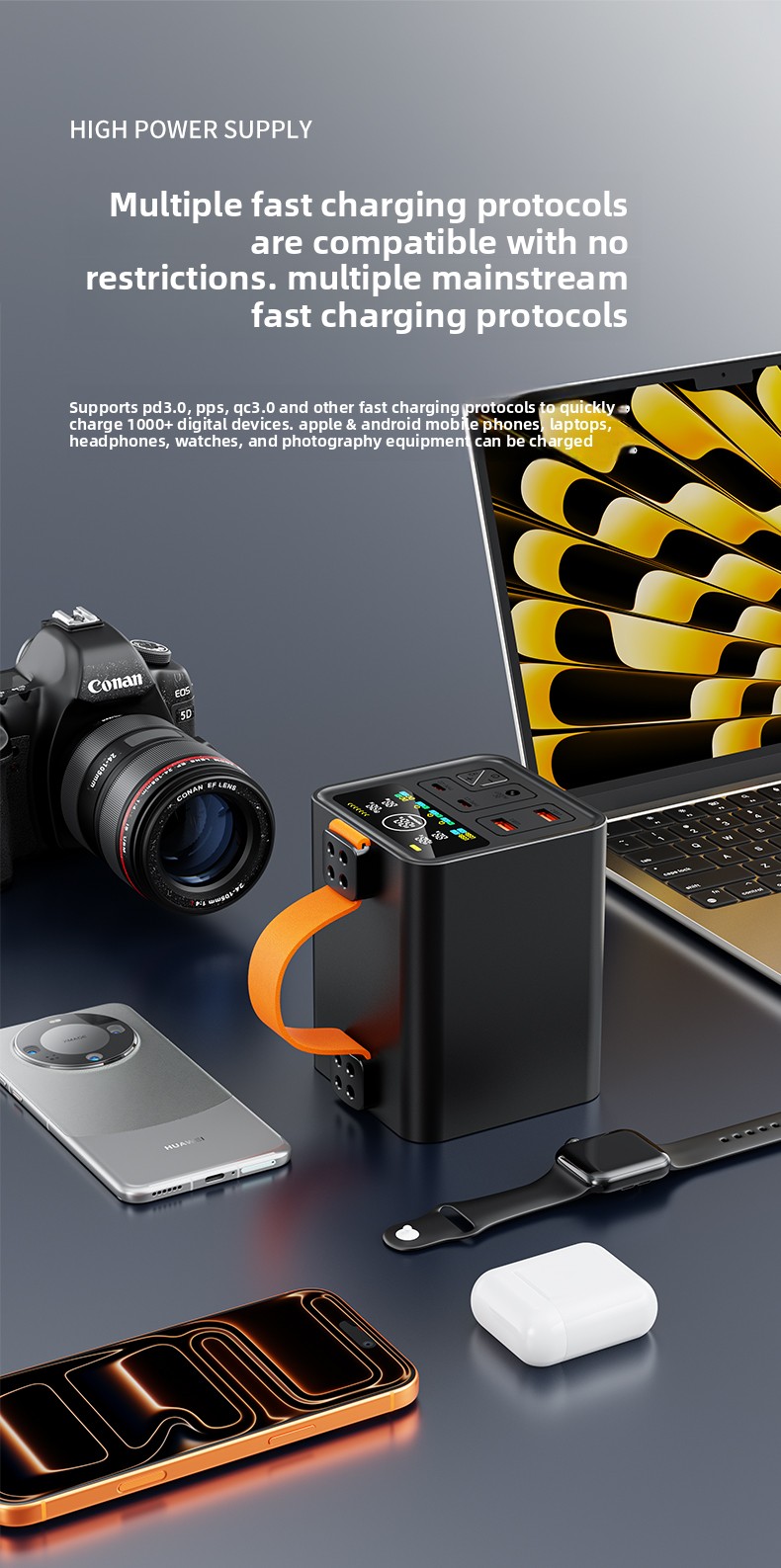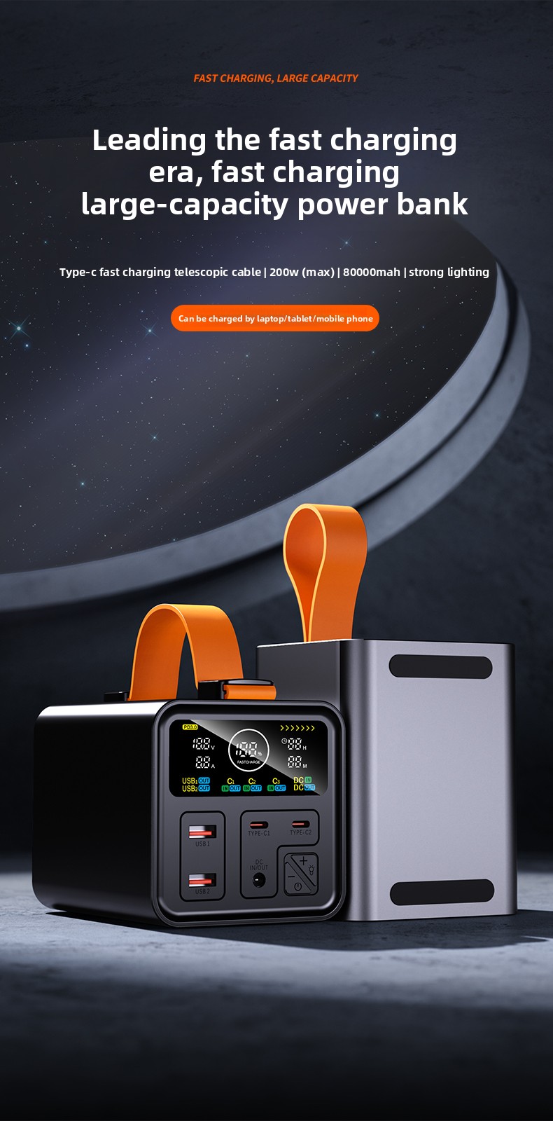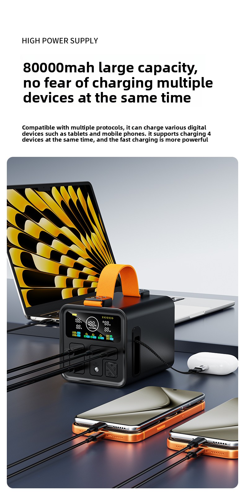 Meet the ultimate high‑capacity power station – designed for professionals, travelers, campers, and anyone who needs serious off‑grid energy. With a massive 80,000mAh (296Wh) battery and 200W total output, this power bank charges two laptops at full speed, powers DC devices, and keeps your entire kit running for days.