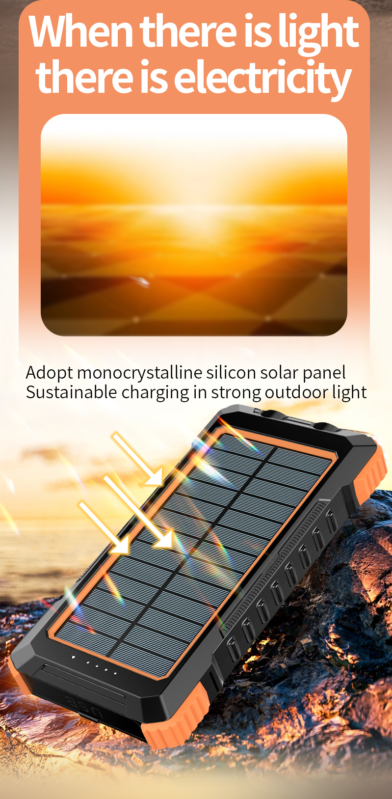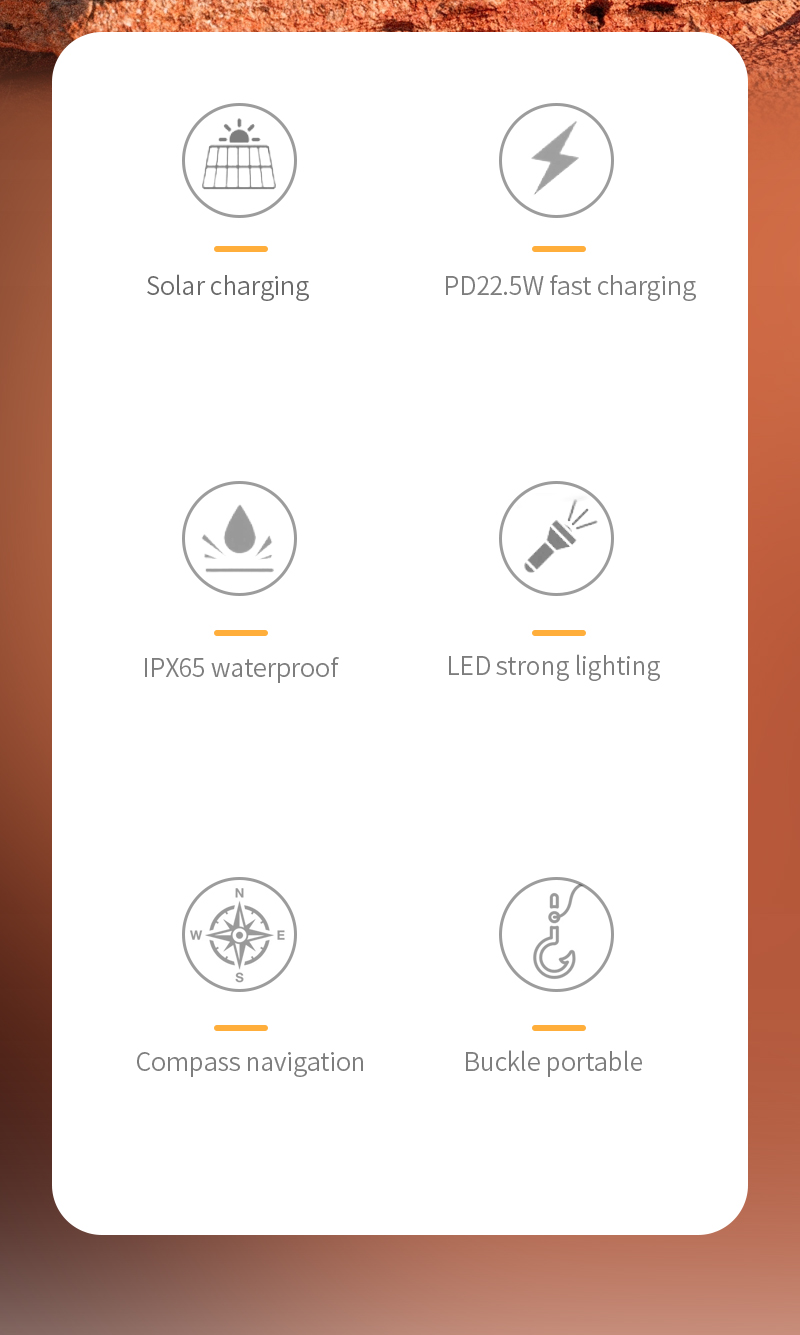 Forgot to charge? No problem. The integrated high-efficiency monocrystalline solar panel (5.5V/2W) provides a crucial emergency trickle charge from sunlight. While not for full, rapid charges, it's a vital lifeline for extending battery life during extended hikes, camping trips, or in emergency preparedness kits. Every bit of sunshine adds power to your reserve.